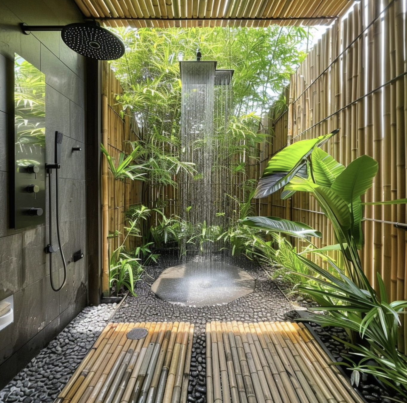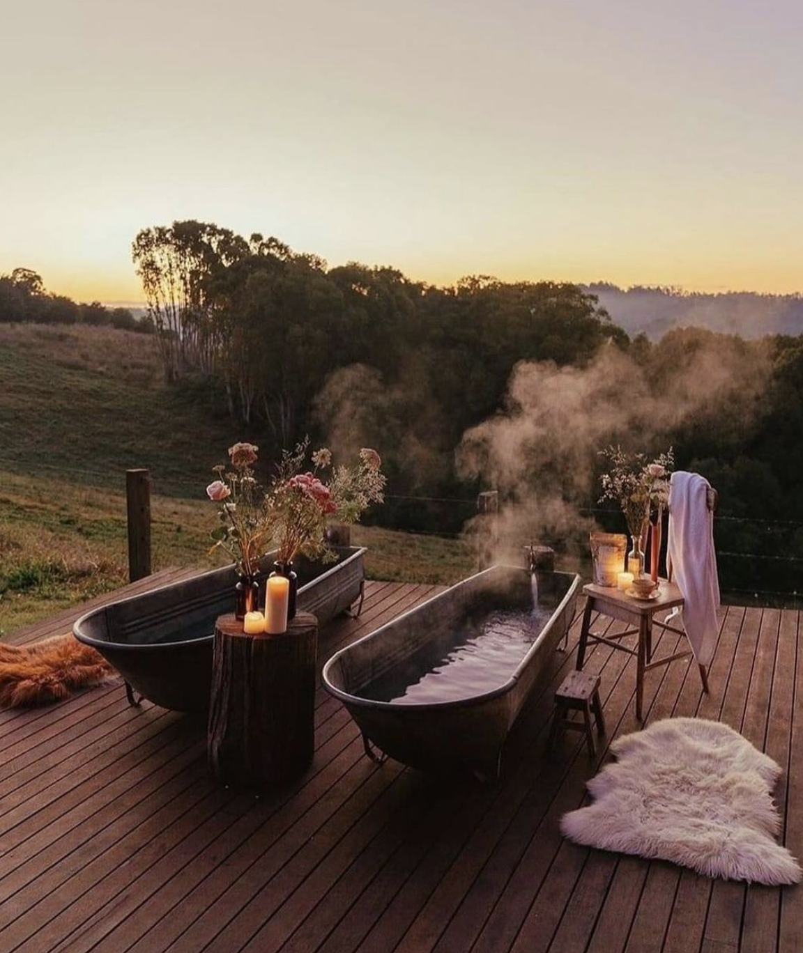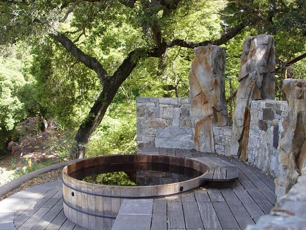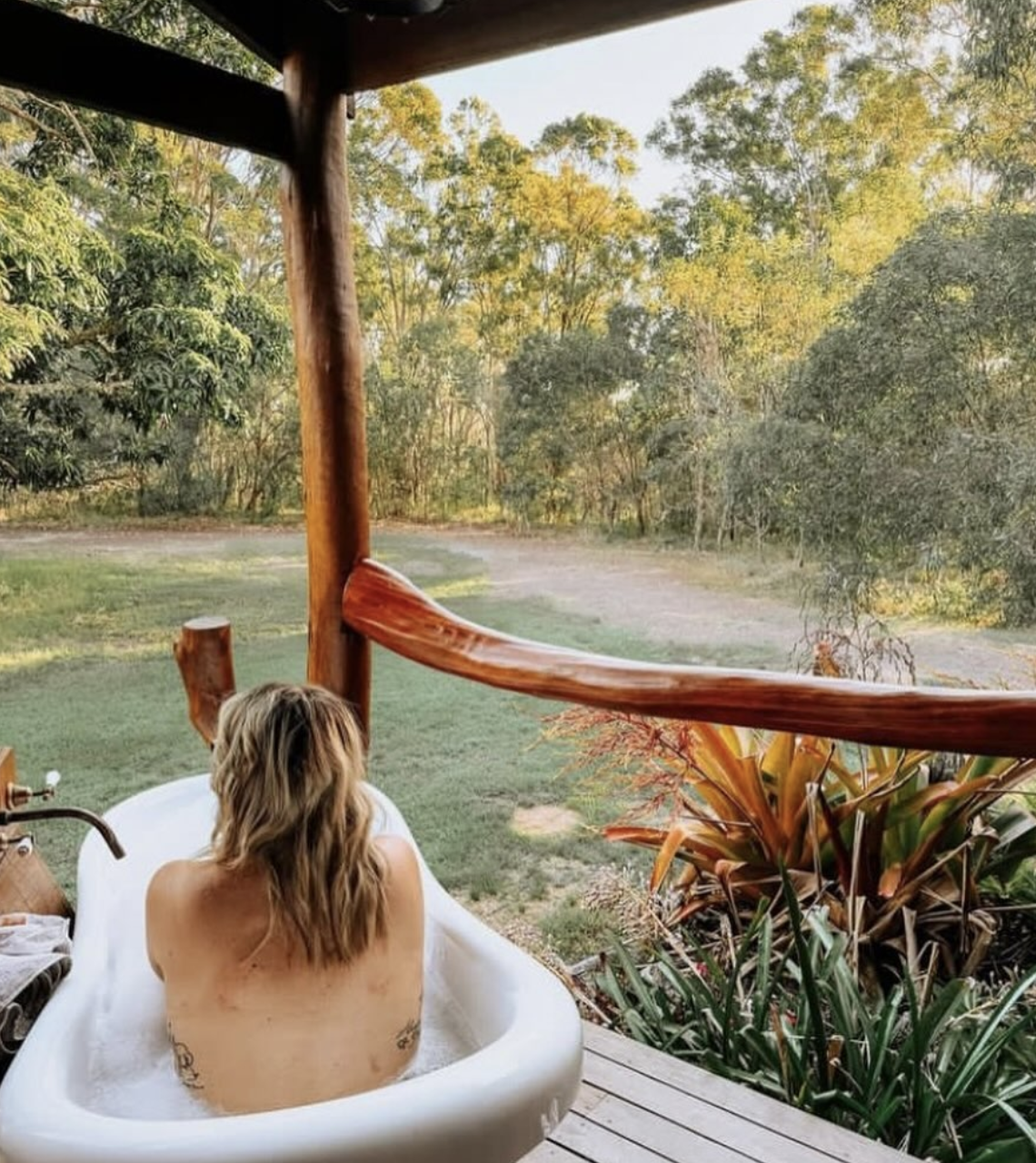 Once you have a tub, it’s also easy to add a shower. Sita Rupe likes extending a shower head into overhanging trees. This provides privacy and hides the shower unit, almost making it feel like you’re taking a rain shower.