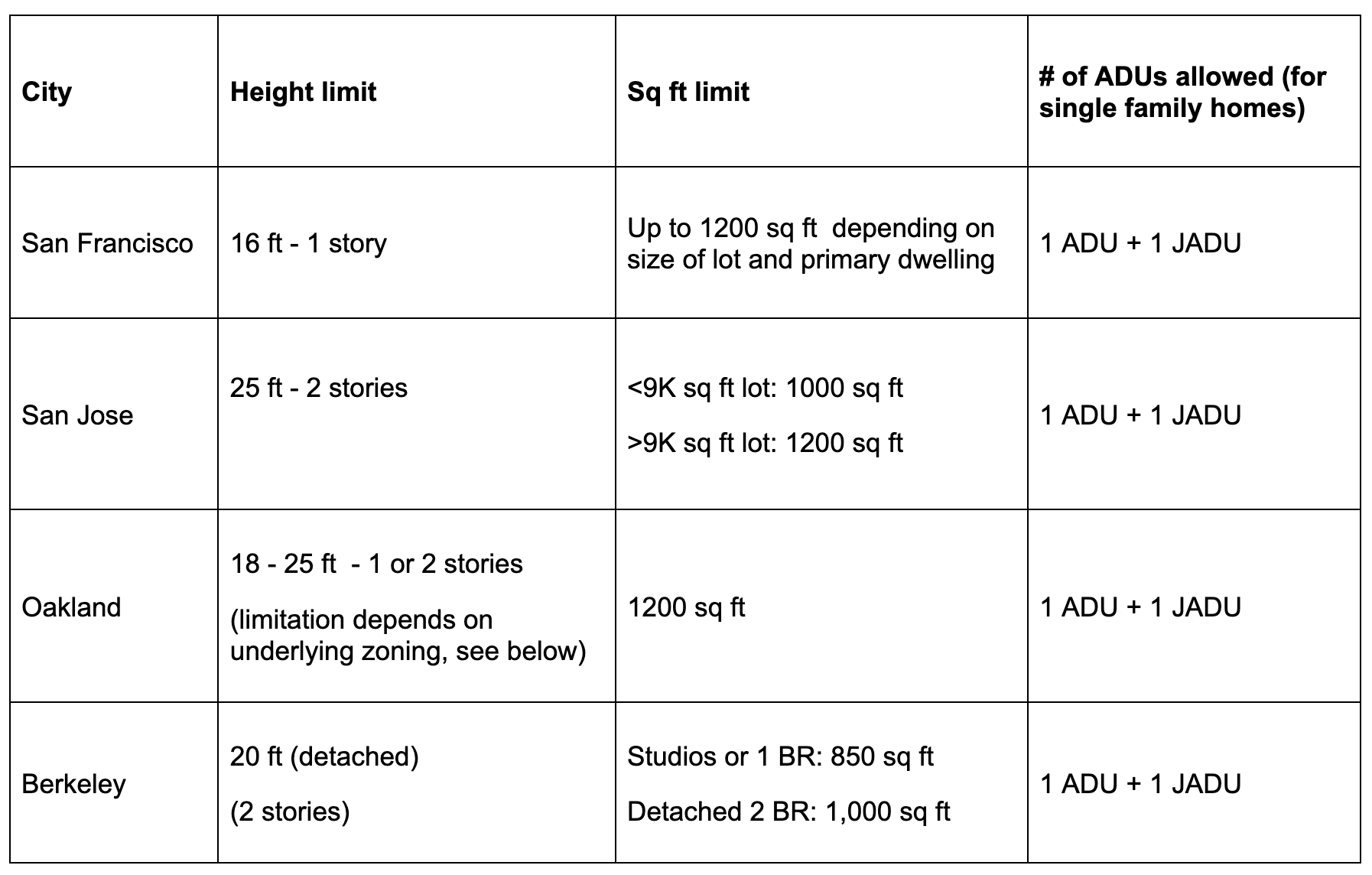 Generally speaking, if your planned ADU is less than 800 sq ft, less than 16’ tall, and more than 4’ away from the property line, your city is required to permit it. But thanks in large part to YIMBY advocacy, most major Bay Area cities’ ADU rules are significantly more permissive than the state minimums. It’s worth checking to see what’s allowed in the city where you plan to purchase a home.
