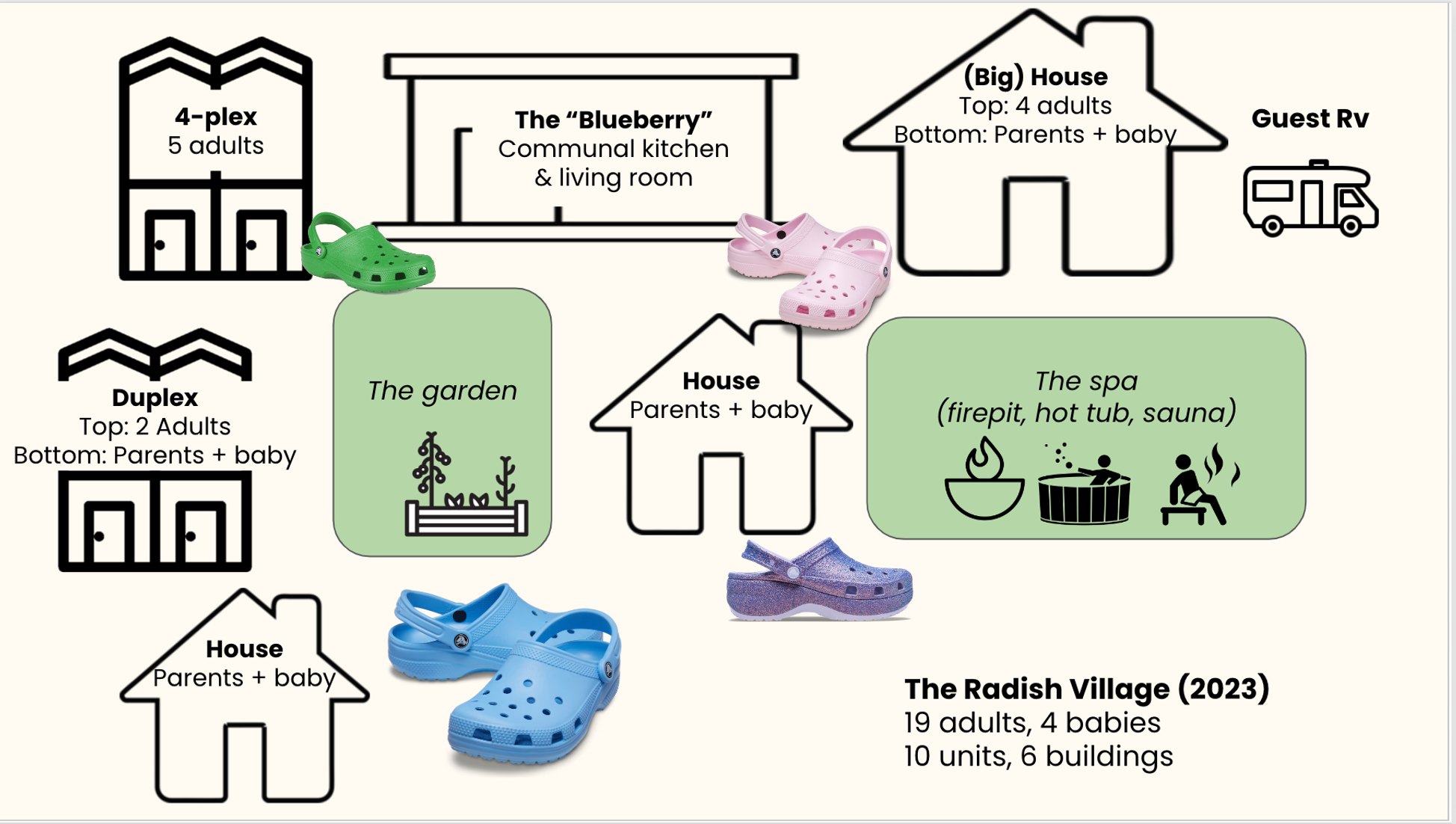 At Radish, every new resident is issued a pair of Crocs upon arrival to navigate the 6 neighboring buildings. It’s like being handed your house keys and your social life in one go.