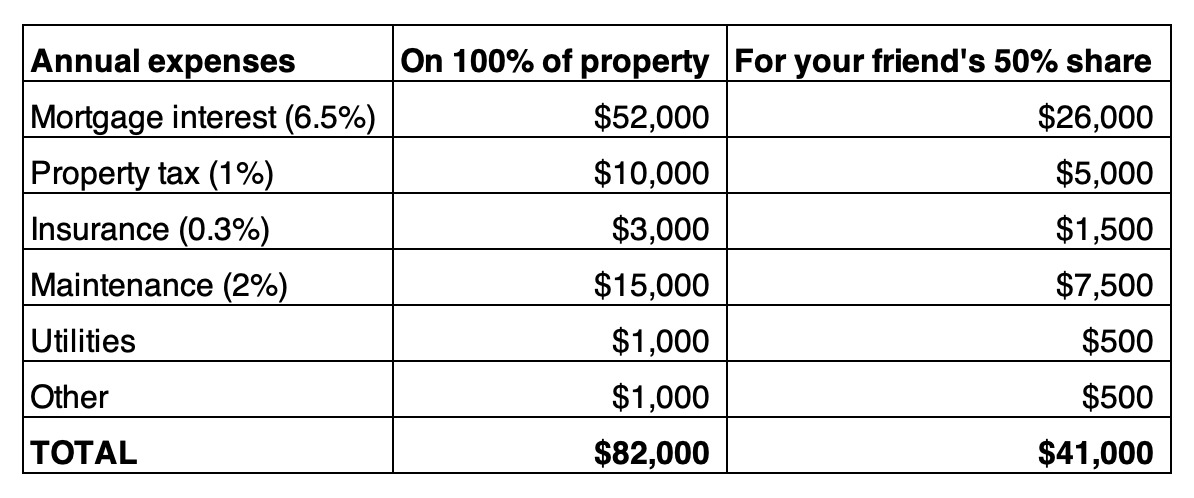 Here’s what property expenses might look like for a $1M property. The template has suggestions on how and where to find this information for your property. Note: We use only the interest part of the mortgage, not the principal, because your friend won't be getting any of that in this case.